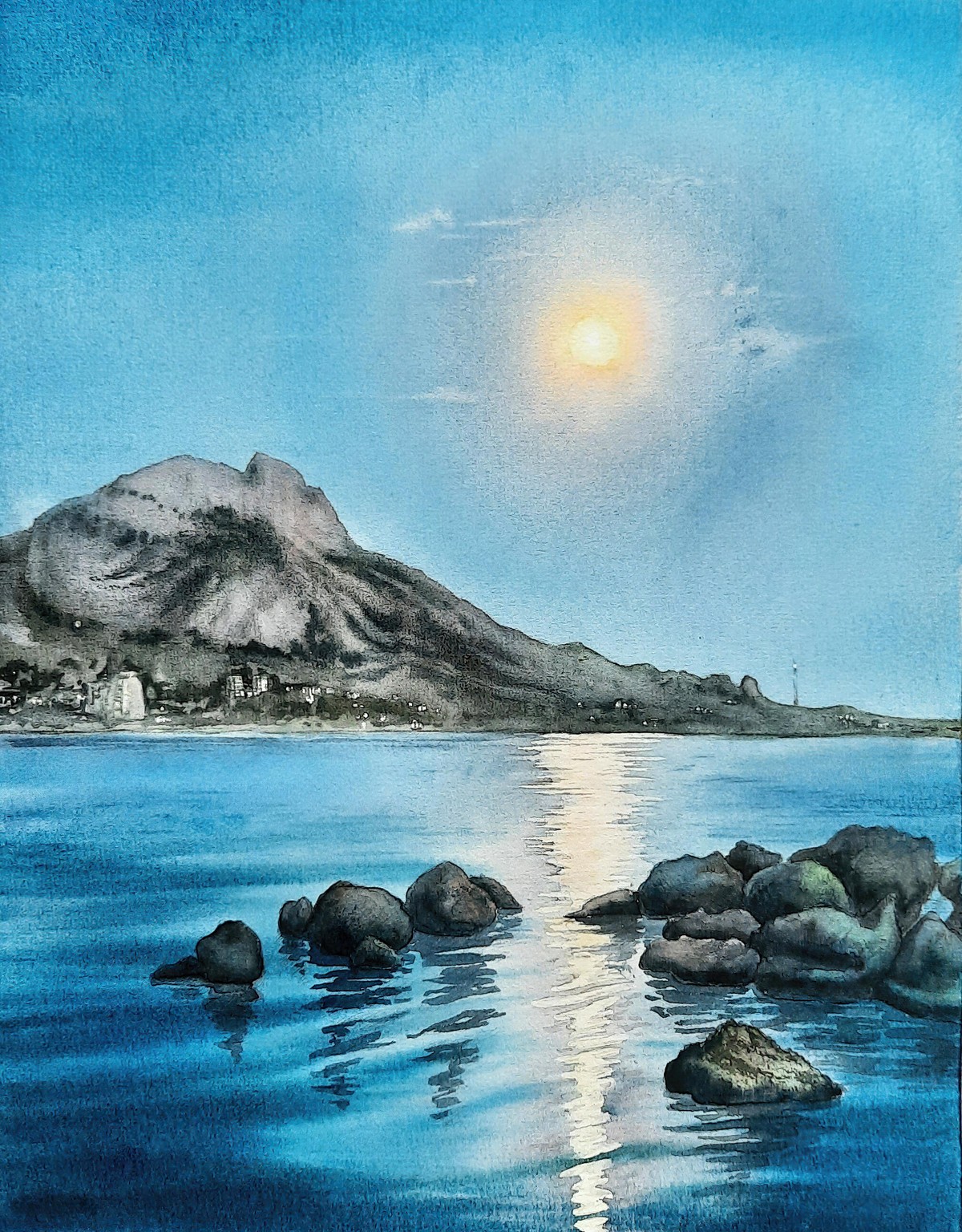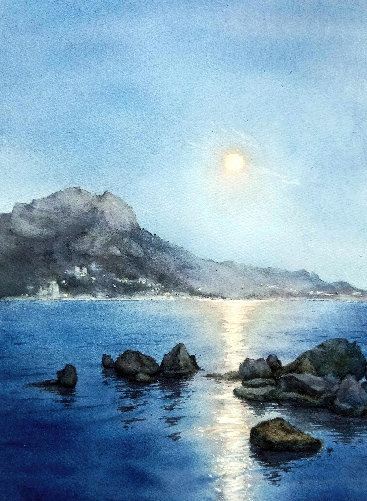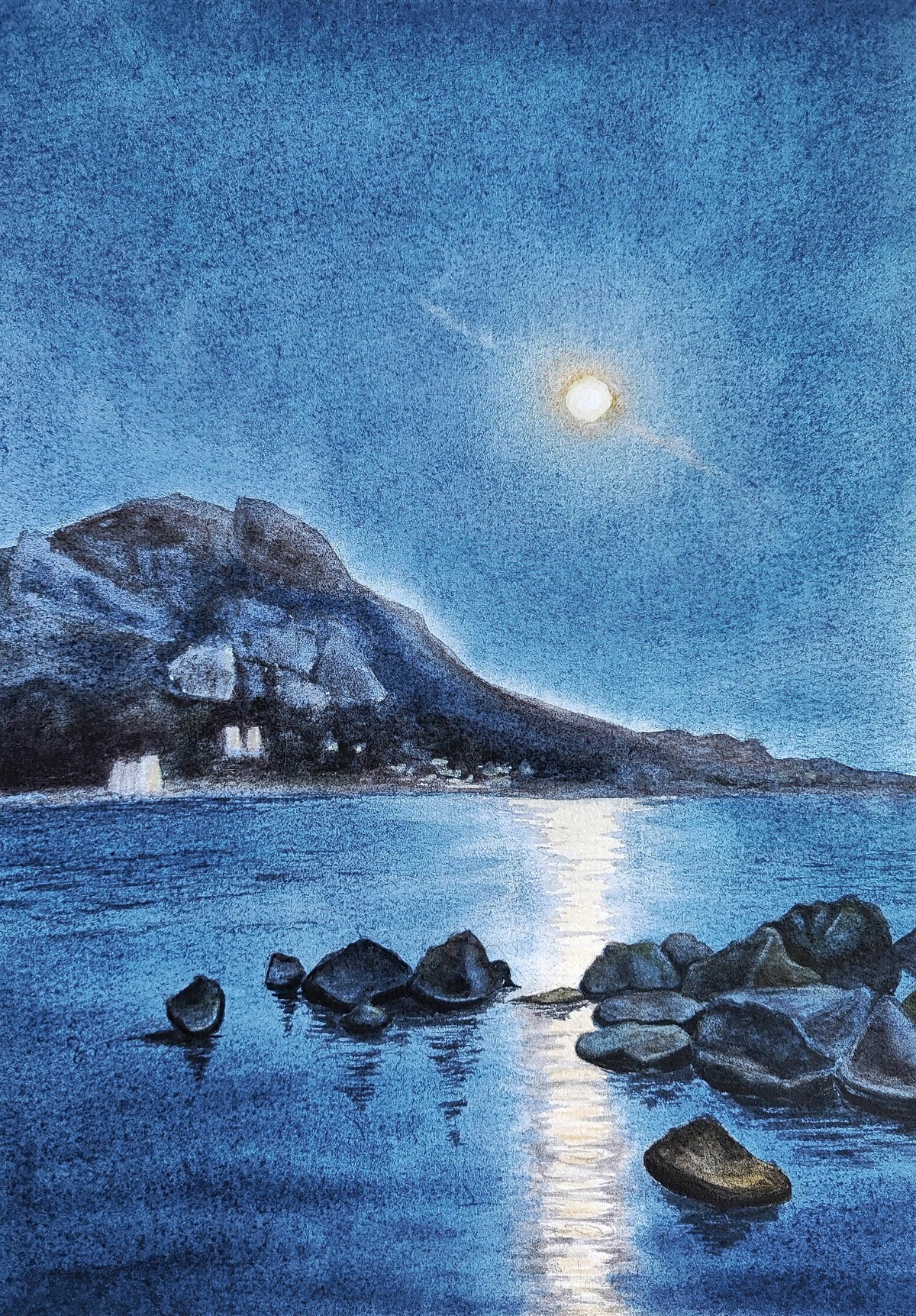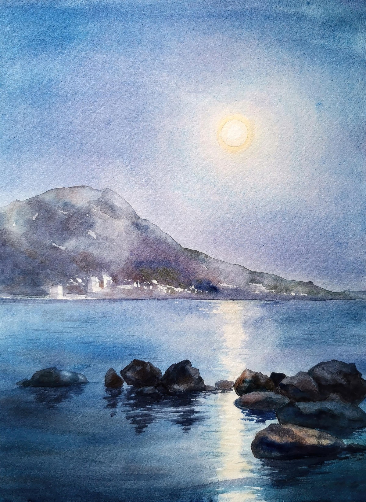 - Напишем луну и создадим облака с помощью техники вытеснения;