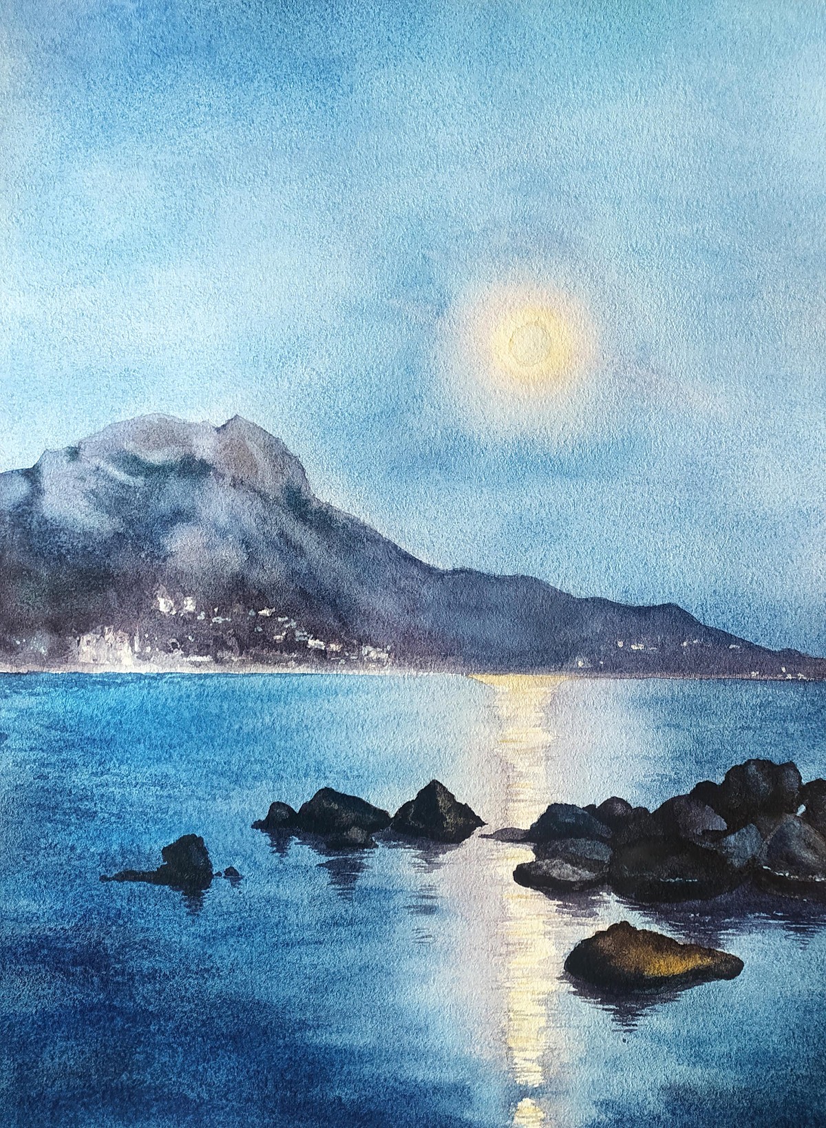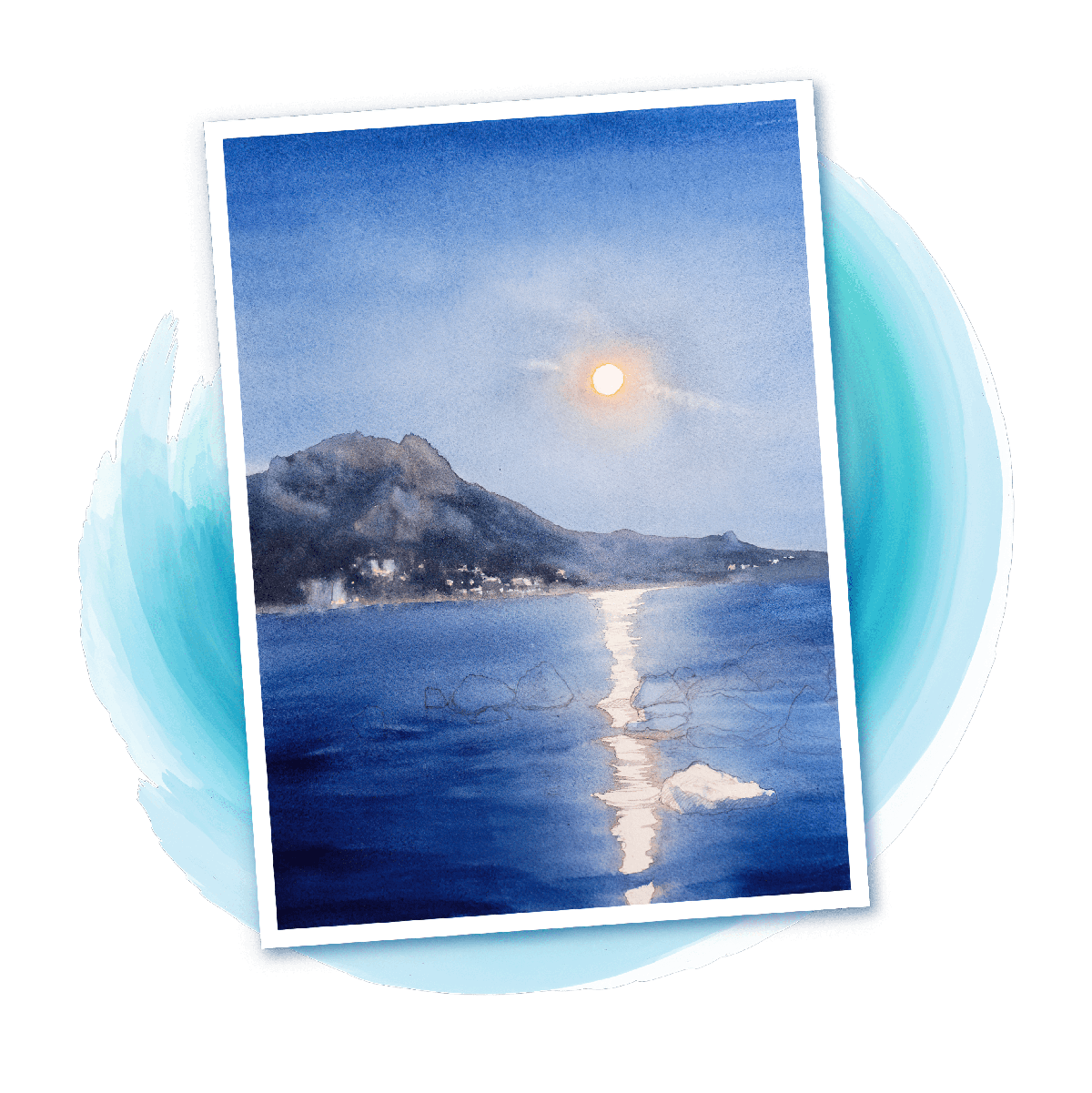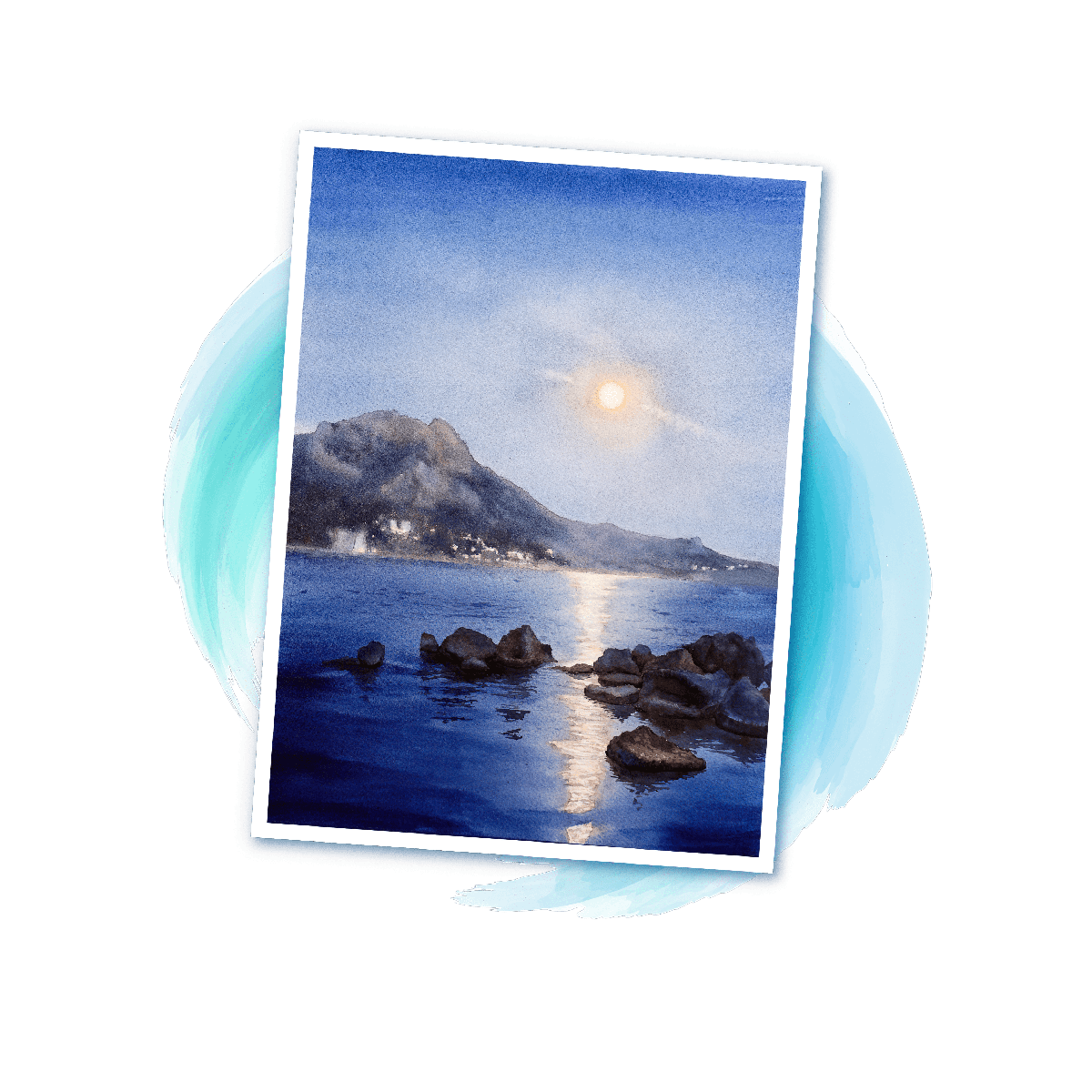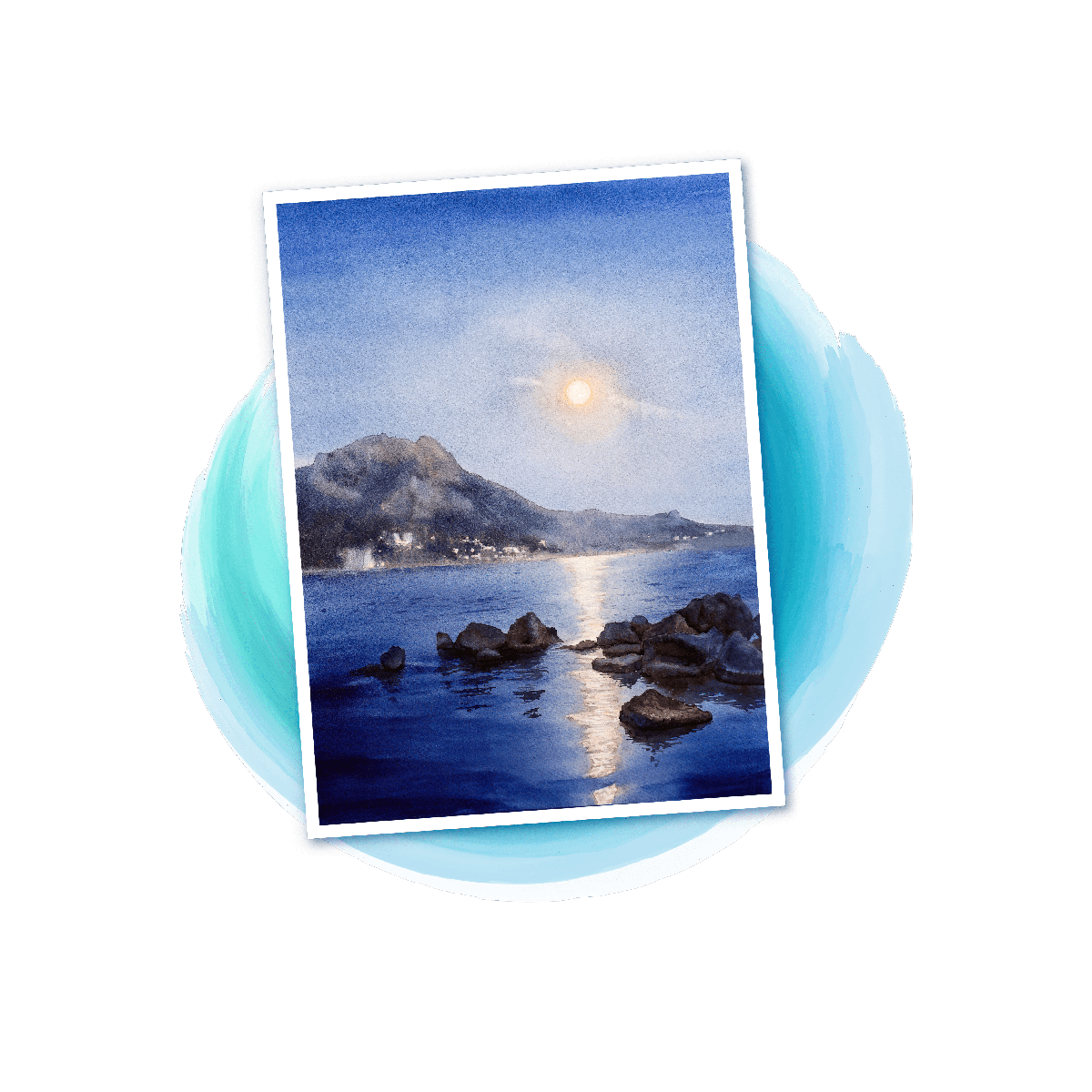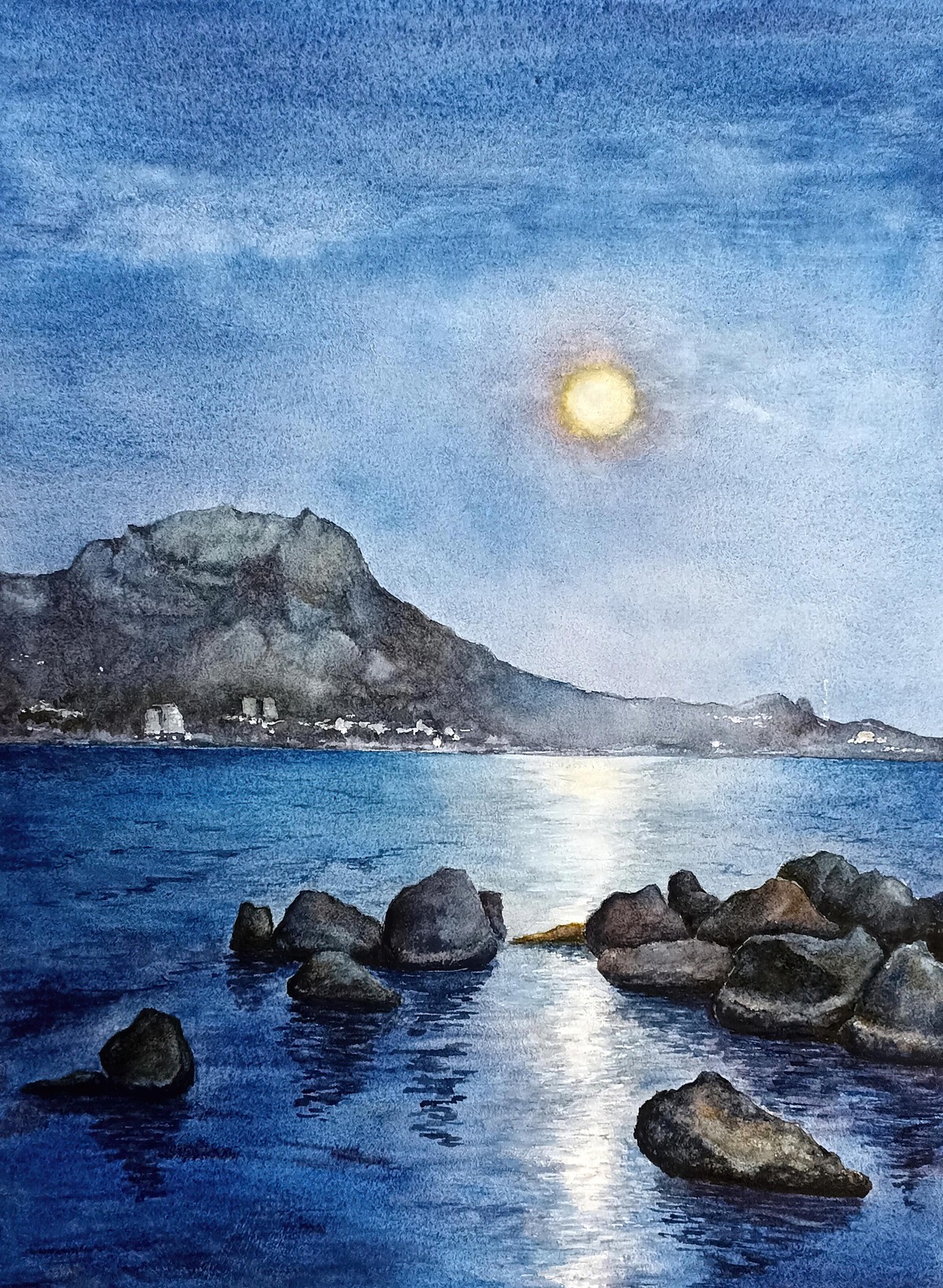 - Напишем луну и создадим облака с помощью техники вытеснения;