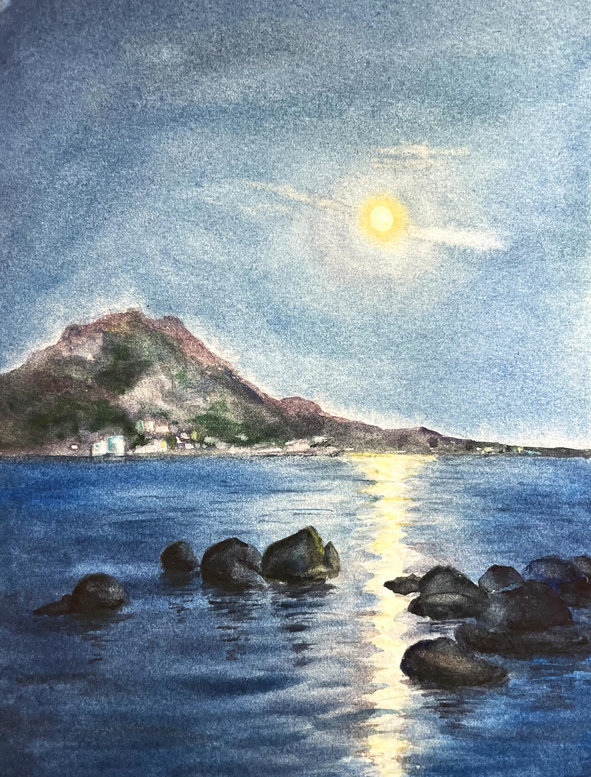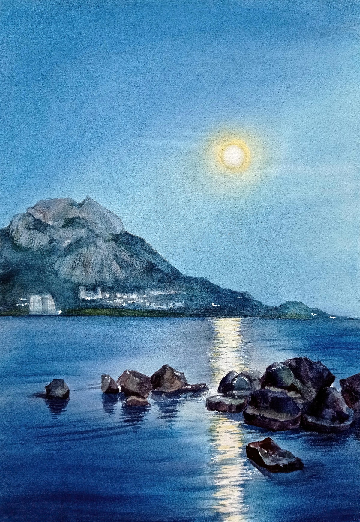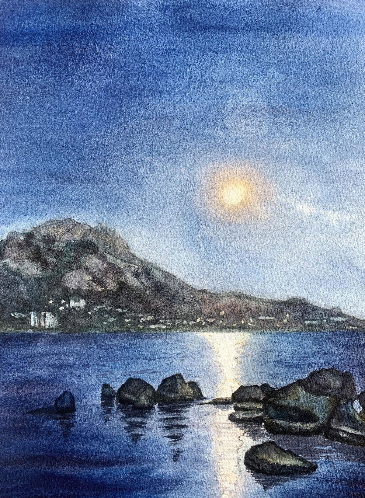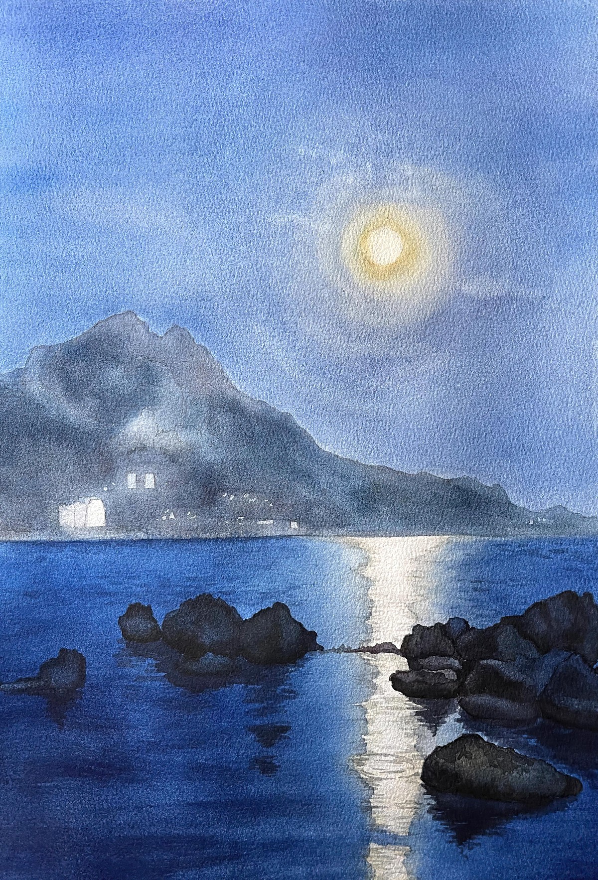 - Напишем луну и создадим облака с помощью техники вытеснения;